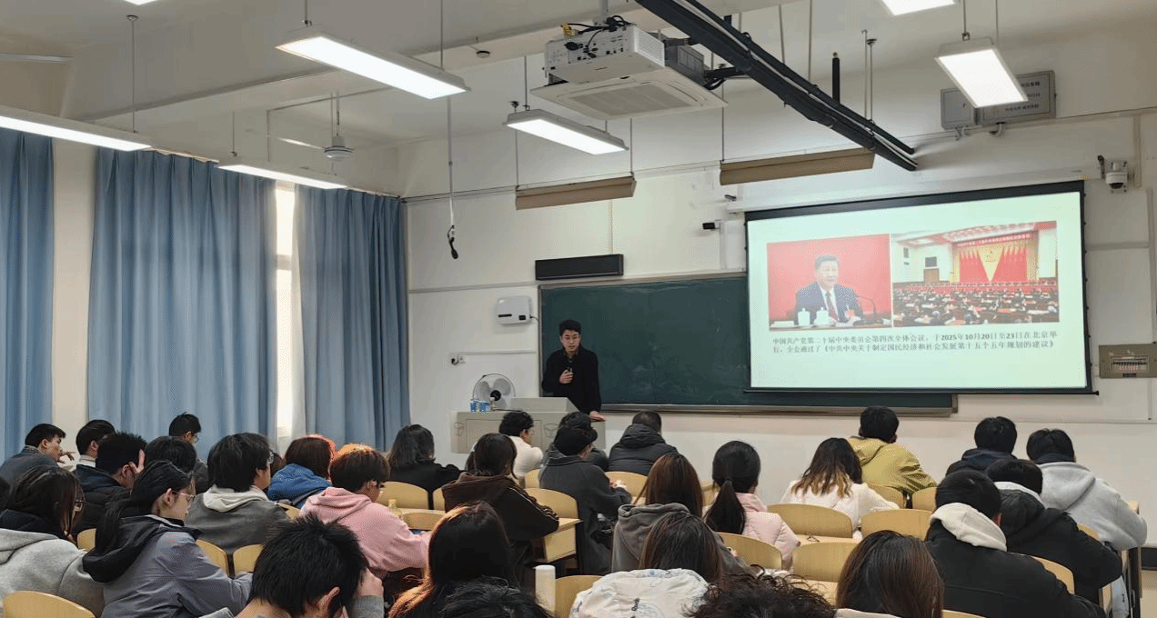 宣讲队成员刘泽宽以“奋进‘十五五’ 艺青年勇担当”为核心主线,系统解读了党的二十届四中全会的重大历史意义和实践要求。结合全会审议通过的《中共中央关于制定国民经济和社会发展第十五个五年规划的建议》,宣讲队从“十五五”时期的历史方位、“五个以”“两个推动”“一个确保”指导方针及七大发展目标切入,用“青言青语”阐释宏大叙事,让理论宣讲既有政治高度又有青春温度。针对艺术学院专业特色,宣讲队重点围绕“文化传承创新”“高质量发展中的艺术担当”等议题展开,结合学院师生打造“荆楚名贤”文化IP、活化武汉老字号设计等鲜活案例,引导学子找准专业能力与国家需求的结合点,将艺术追求融入文化强国建设大局。