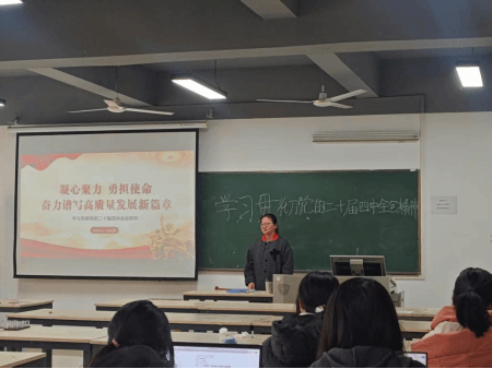 为深入学习贯彻党的二十届四中全会精神,精准把握全会新思想、新部署、新要求,切实统一思想与行动。12月15日,艺术与设计学院环境设计系教工党支部书记翁雯霞在70409教室,面向2025级设计学研究生开展“凝心聚力 勇担使命 奋力谱写高质量发展新篇章”主题宣讲,系统解读全会精神。宣讲围绕全会时代背景、重大意义、核心内容及落地实践等方面展开深入探讨,助力参会研究生深刻领会核心要义、凝聚发展共识、明确实践方向,为高质量发展注入强劲动力。