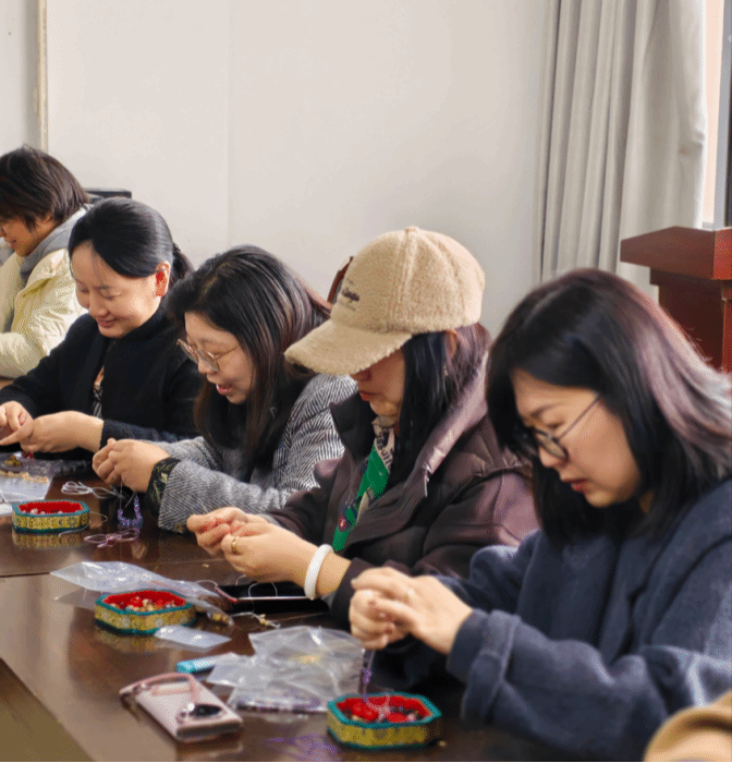 进入实操环节,女教职工们纷纷挑选心仪的珠饰与配饰,全身心投入到创作中:大家专注地穿珠、调整配色顺序。指尖灵动穿梭,将各色珠子与雕花配饰串联成独属于自己的手串样式。