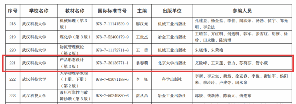 近日,湖北省教育厅公示“湖北省普通高等教育本科省级规划教材建议名单”,我院翁春萌、艾险峰等老师联合编写的《产品形态设计》(第3版)成功入选。